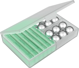- 20 spīdošas magnētiskās nūjiņas, 20 tērauda lodītes, 2 stabilas pamatnes (kvadrāts un piecstūris) melnā krāsā