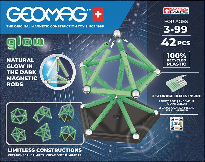 Atklāj magnētiskās konstruktoru pasaules burvību ar GEOMAG Glow, kurā ir 42 detaļas, kas tumsā fosforescē. Apgaismo, izslēdz gaismu un vēro, kā tavi veidojumi mirdz! Komplekts veicina kreativitāti, sīko motoriku un telpisko iztēli, un tas ir izgatavots ar Šveices precizitāti un uzsvaru uz drošību.