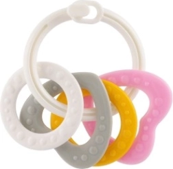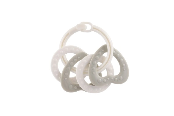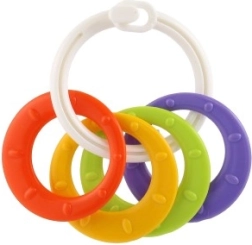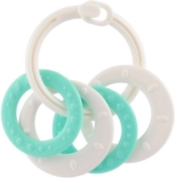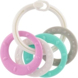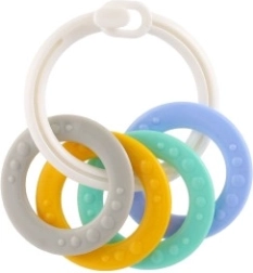 Piemērots bērniem no 3 mēnešu vecuma, šis košļājamo rotaļlietu komplekts satur krāsainus plastmasas gredzenus, kas ir ne tikai viegli, bet arī palīdz attīstīt sīko motoriku. Pateicoties daudzveidīgajām struktūrām un formām, rotaļlieta sniedz vairākus maņu stimulus, kas ir paredzēti bērna zobu šķilšanās periodam.