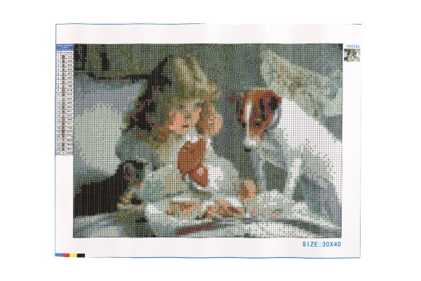Detalizēts motīvs ar meiteni un sunīti 30 × 40 cm izmērā pēc pabeigšanas skaisti mirdz un izcili izskatās rāmī jebkurā interjerā.