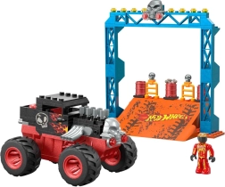 Uzbūvē savu monstru kravas auto un izpildi drosmīgus lēcienus ar rampu! Šis konstruktors HOT WHEELS Mega Bone Shaker Crush Course piedāvā 151 detaļu, no kurām saliksi izturīgu auto ar pull-back piedziņu, rampu un piederumus aizraujošiem kaskadieru braucieniem. Plata riepu protektora saķere, sarkani-melns virsbūves noformējums ar liesmām un galvaskausu un iespēja, ka dekorācija atsitas un atkrīt trieciena brīdī, garantē bezgalīgu izklaidi.