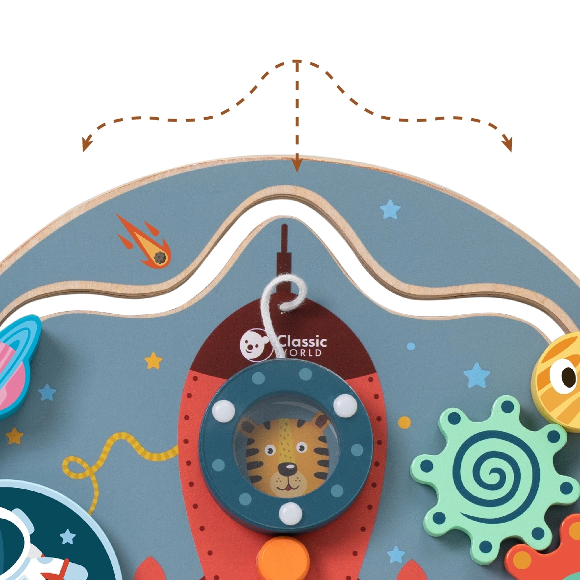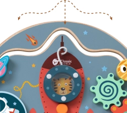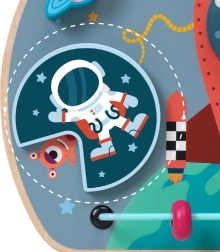 Raķete ar planētām un zvaigznēm dabiski rosina ziņkāri un mudina bērnus atklāt dažādos elementus – no labirinta līdz rotējošiem ritenīšiem.