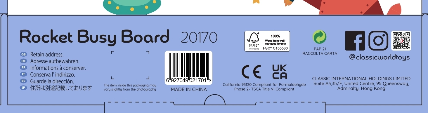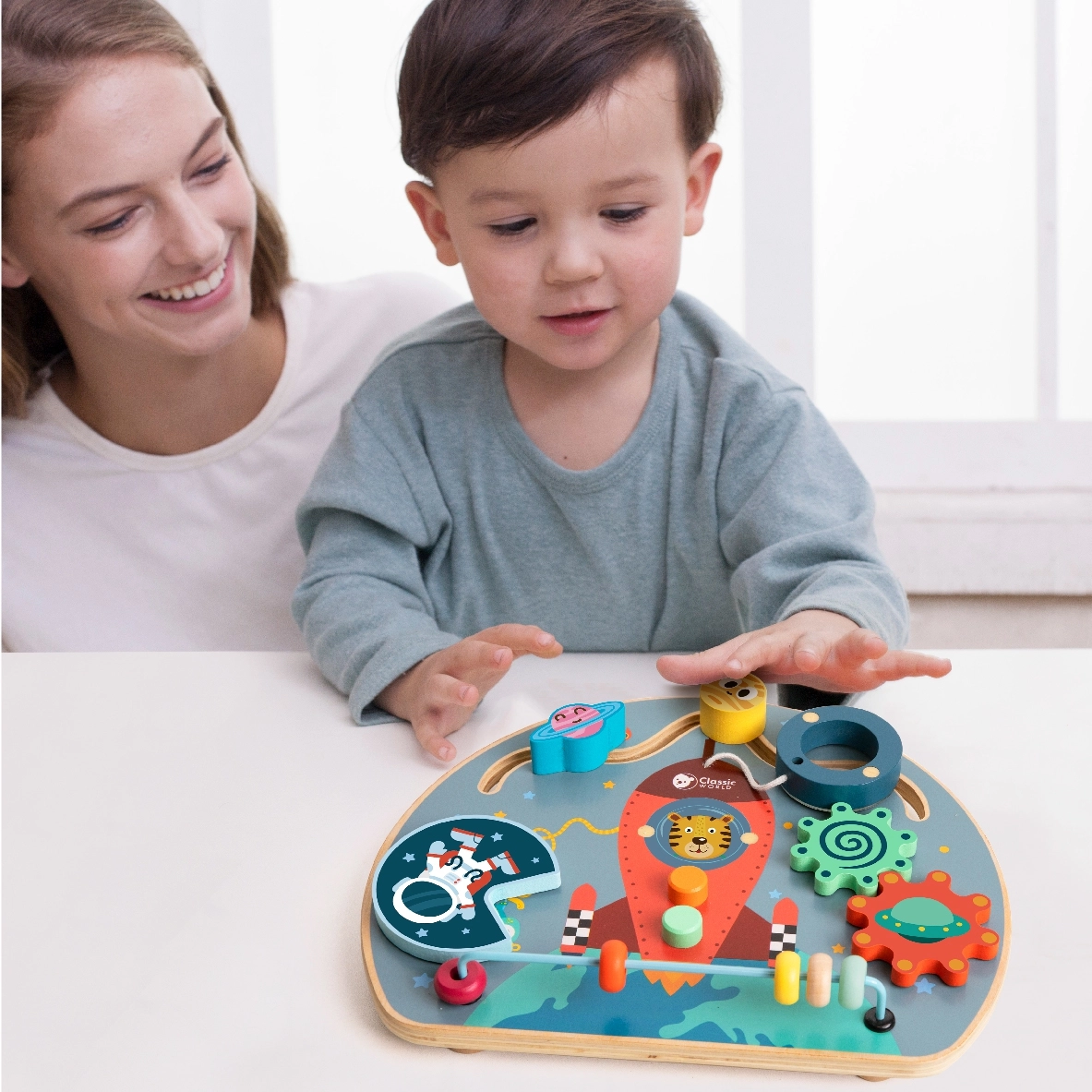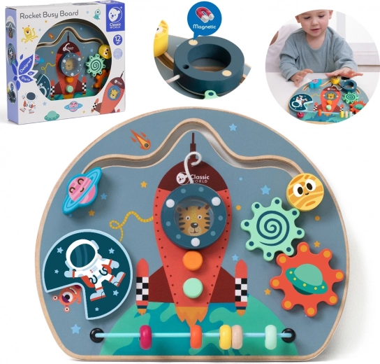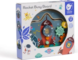 Koka manipulatīvā tāfele raķetes formā no CLASSIC WORLD piedāvā 6-in-1 aizraujošas aktivitātes bērniem no 12 mēnešiem: labirints, krellītes, rotējošs ritenītis, pogas, magnētisks elements un pagriežami kloķīši. Attīsta sīko motoriku, acu–roku koordināciju un radošumu, izgatavota no kvalitatīva koka un krāsota ar netoksiskām krāsām.