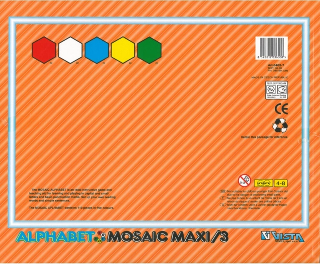Atklāj burtu pasauli ar krāsaino komplektu Alphabet Mosaic Maxi. Pateicoties lielajām detaļām dzeltenā, sarkanā, zaļā, zilā un baltā krāsā, bērni rotaļīgi iepazīst angļu alfabētu, mācās salikt vienkāršus vārdus un attīsta iztēli un pacietību.