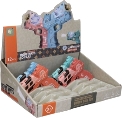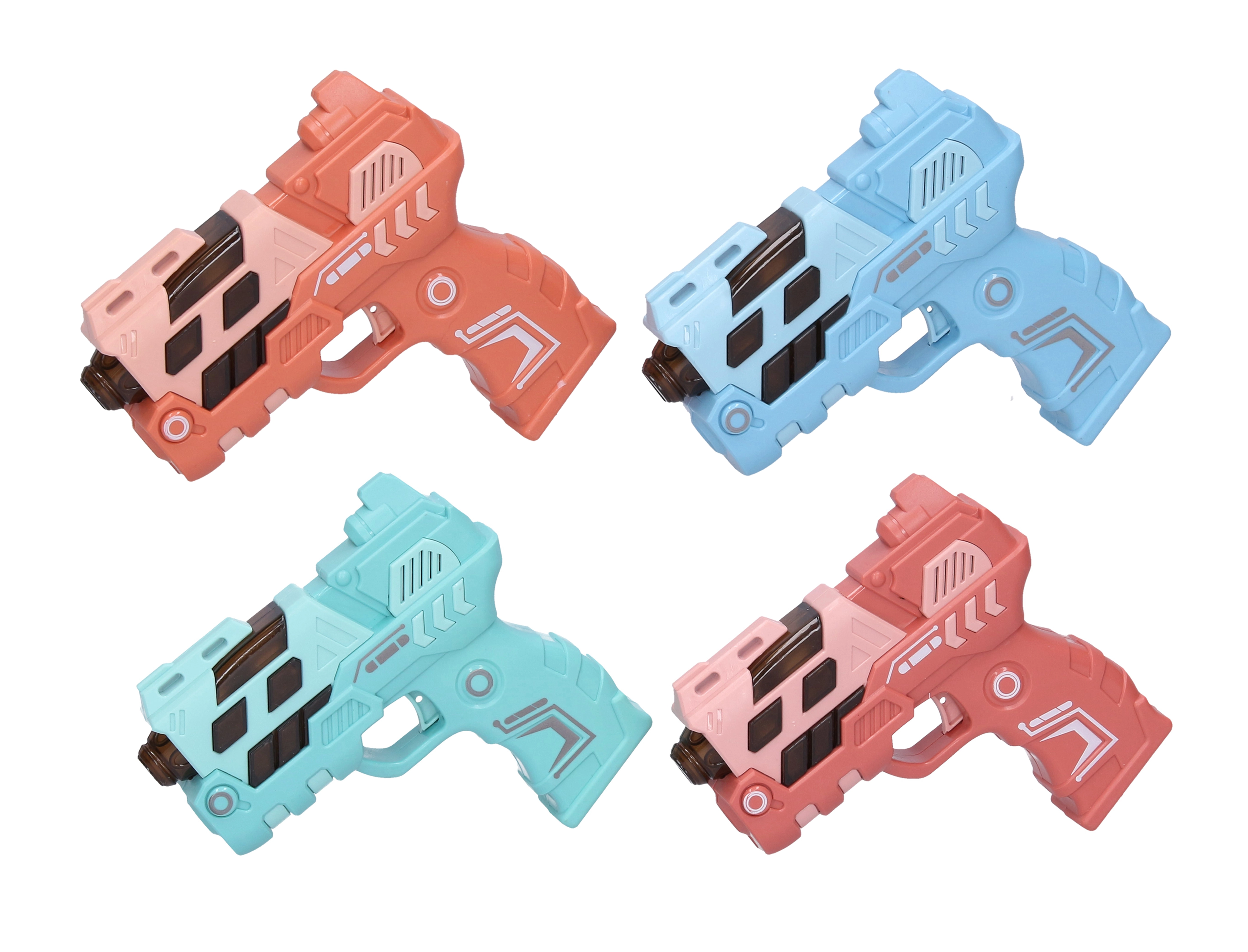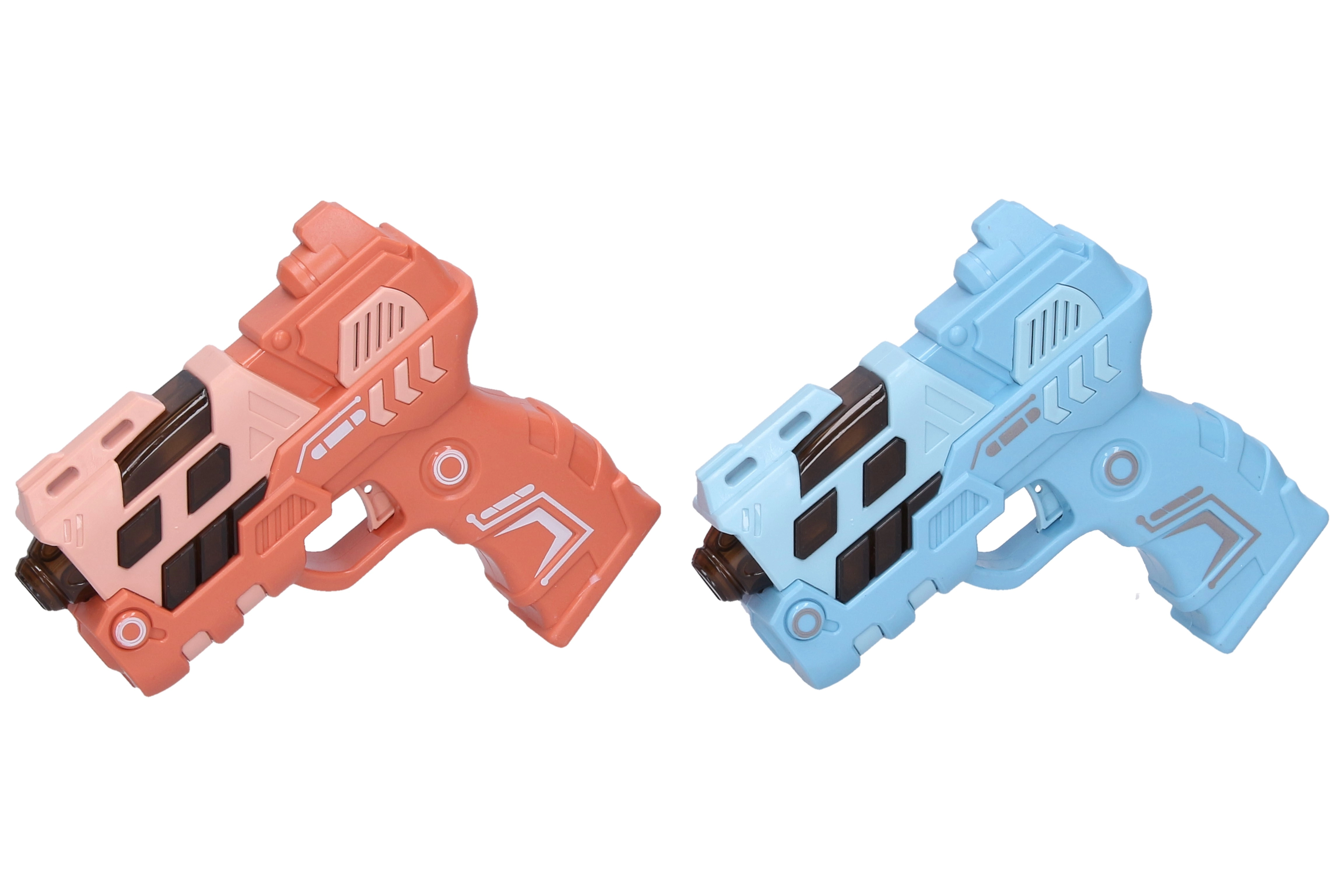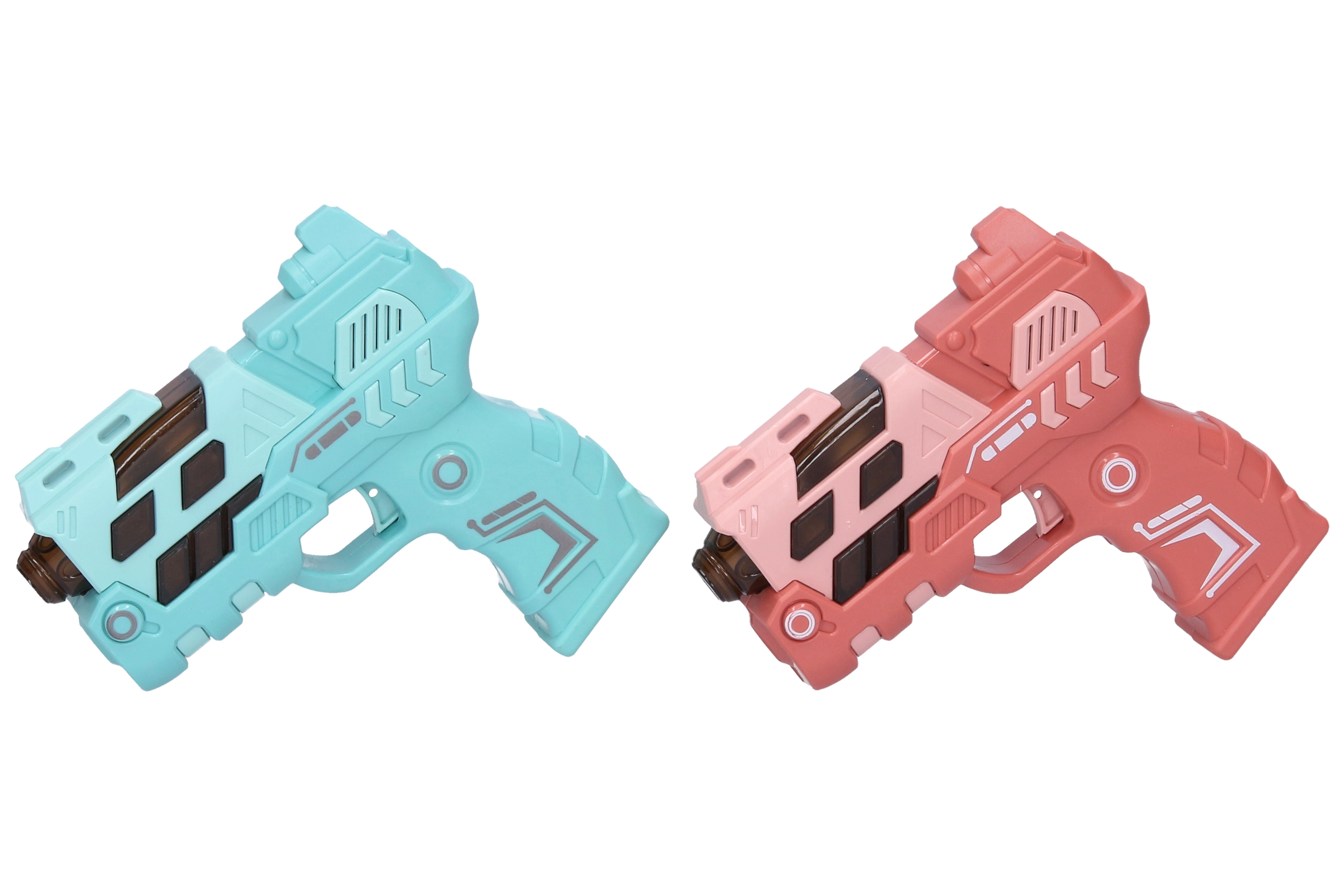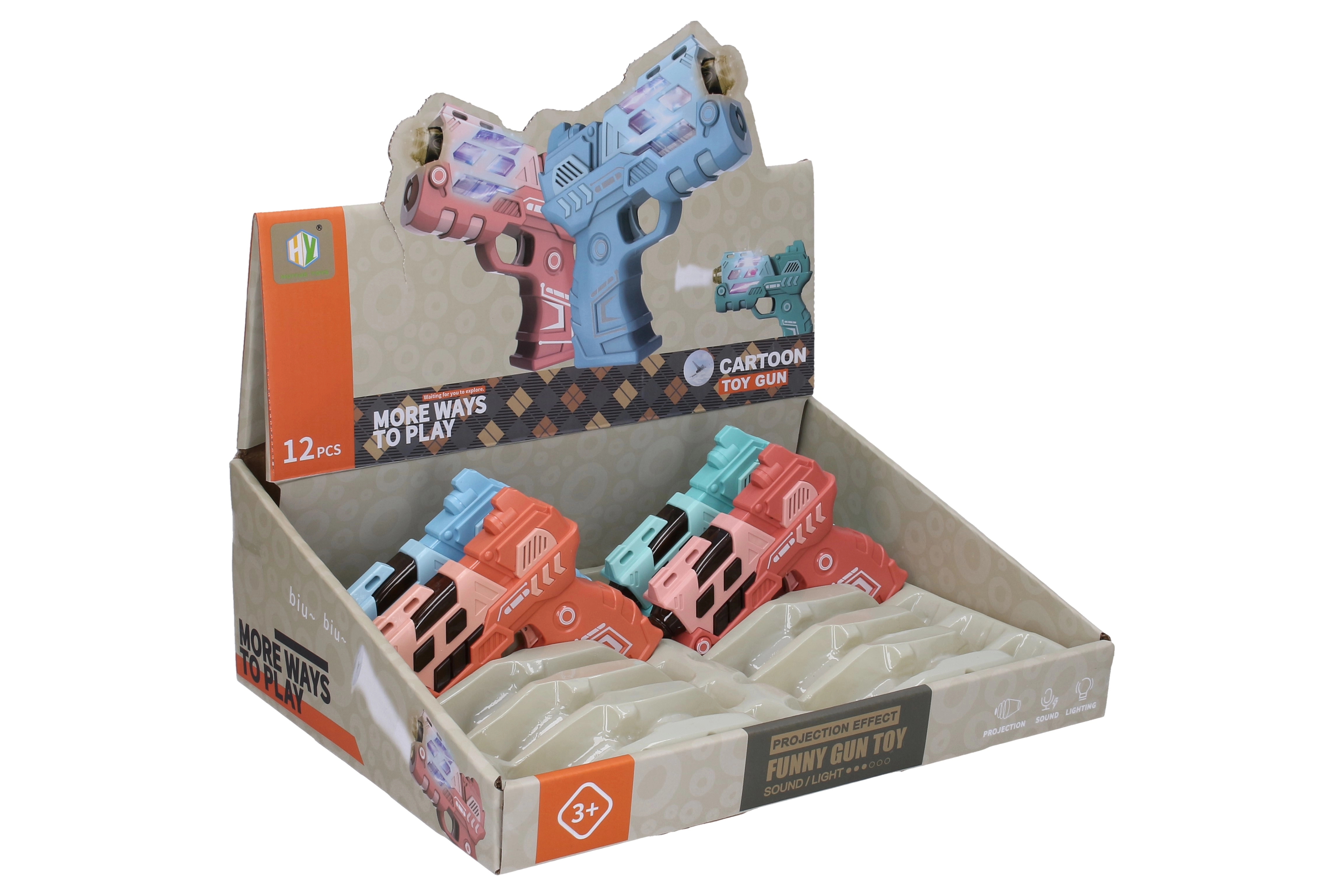 Izklaidējoša bērnu pistole ar izmēru 12 cm piedāvā gaismas un skaņas efektus un arī attēla projekciju vēl lielākai jautrībai. Pieejama 4 krāsu variantos (zila, zaļa, oranža, rozā). Darbojas ar 2× AAA baterijām, kuras nav iekļautas komplektā.