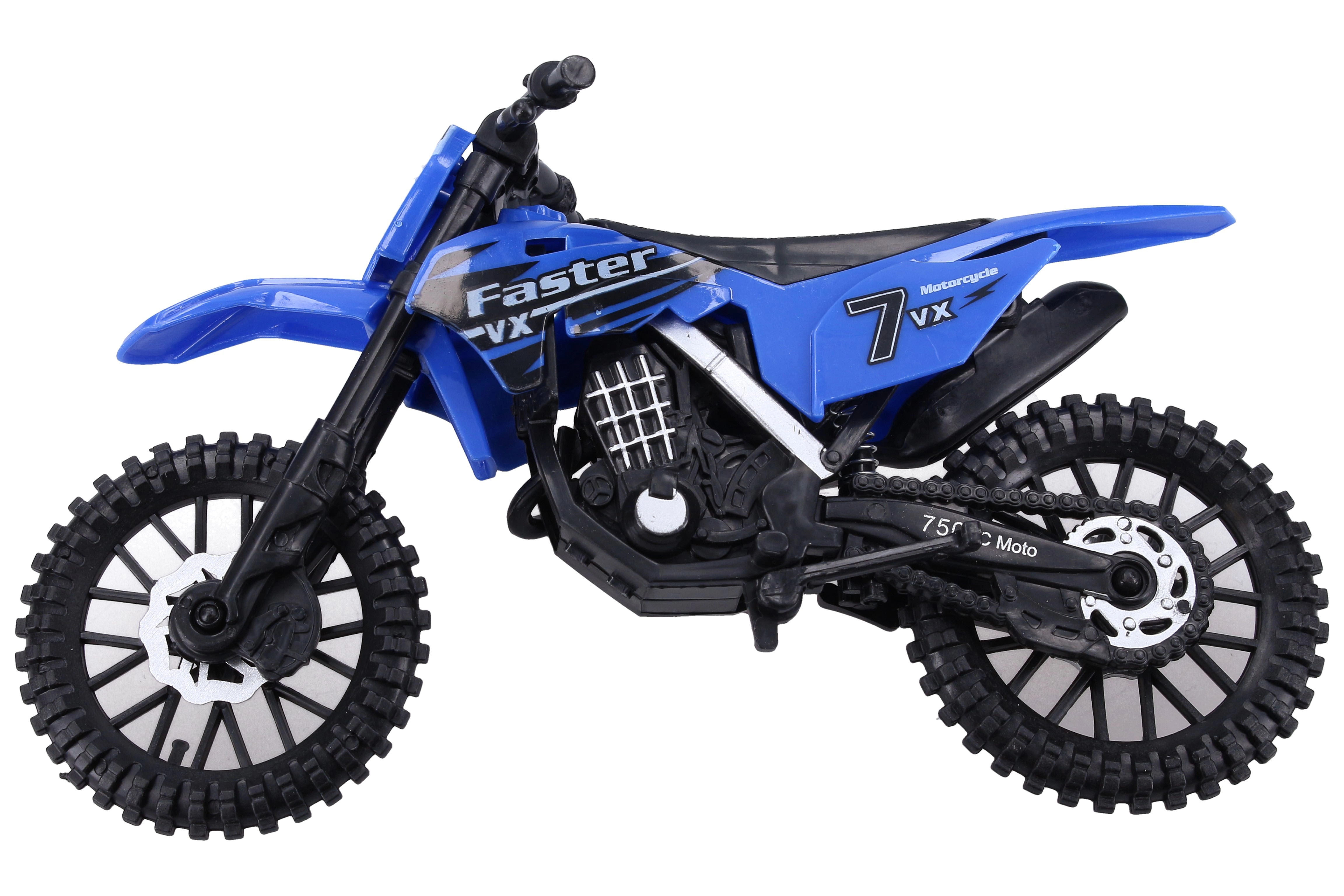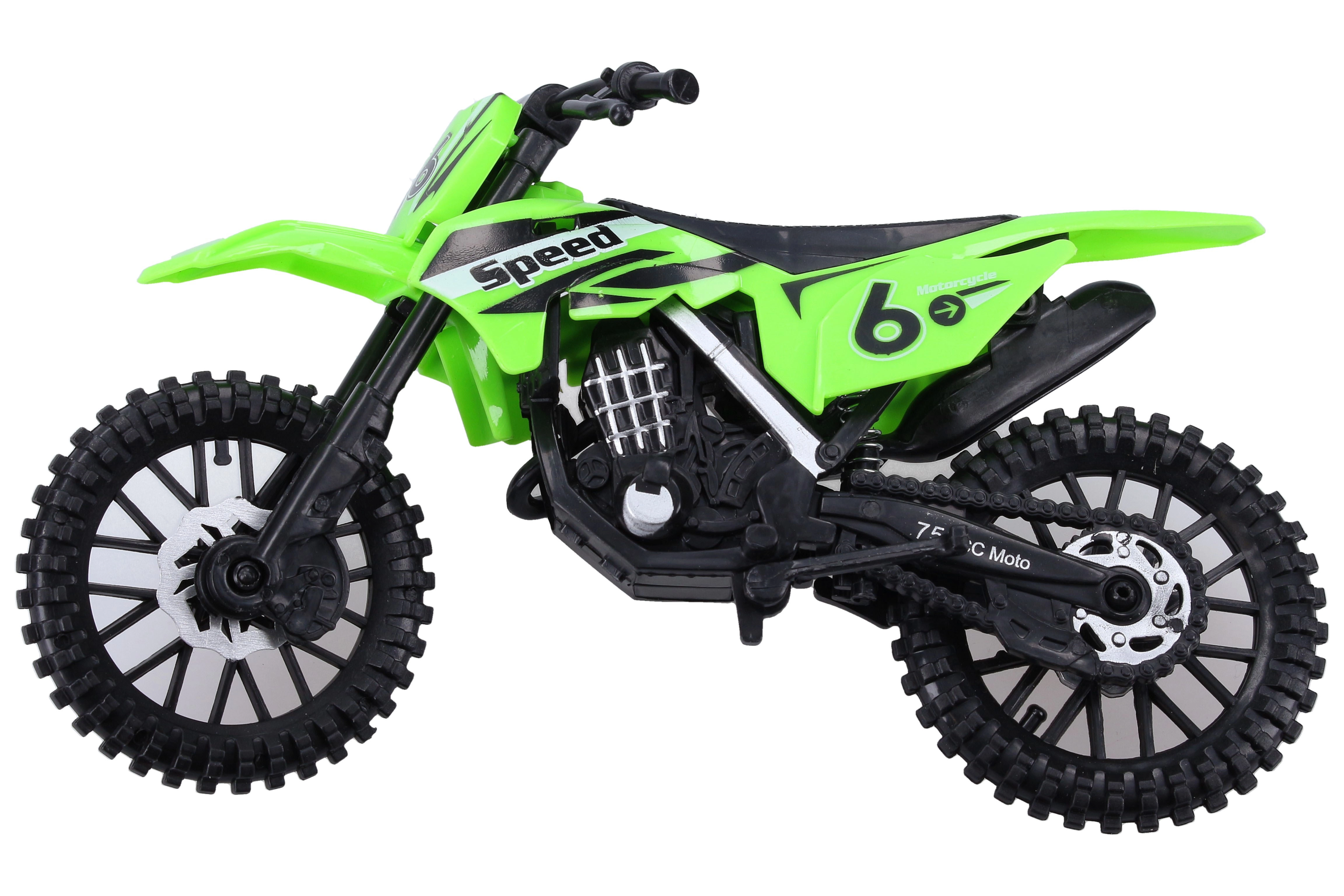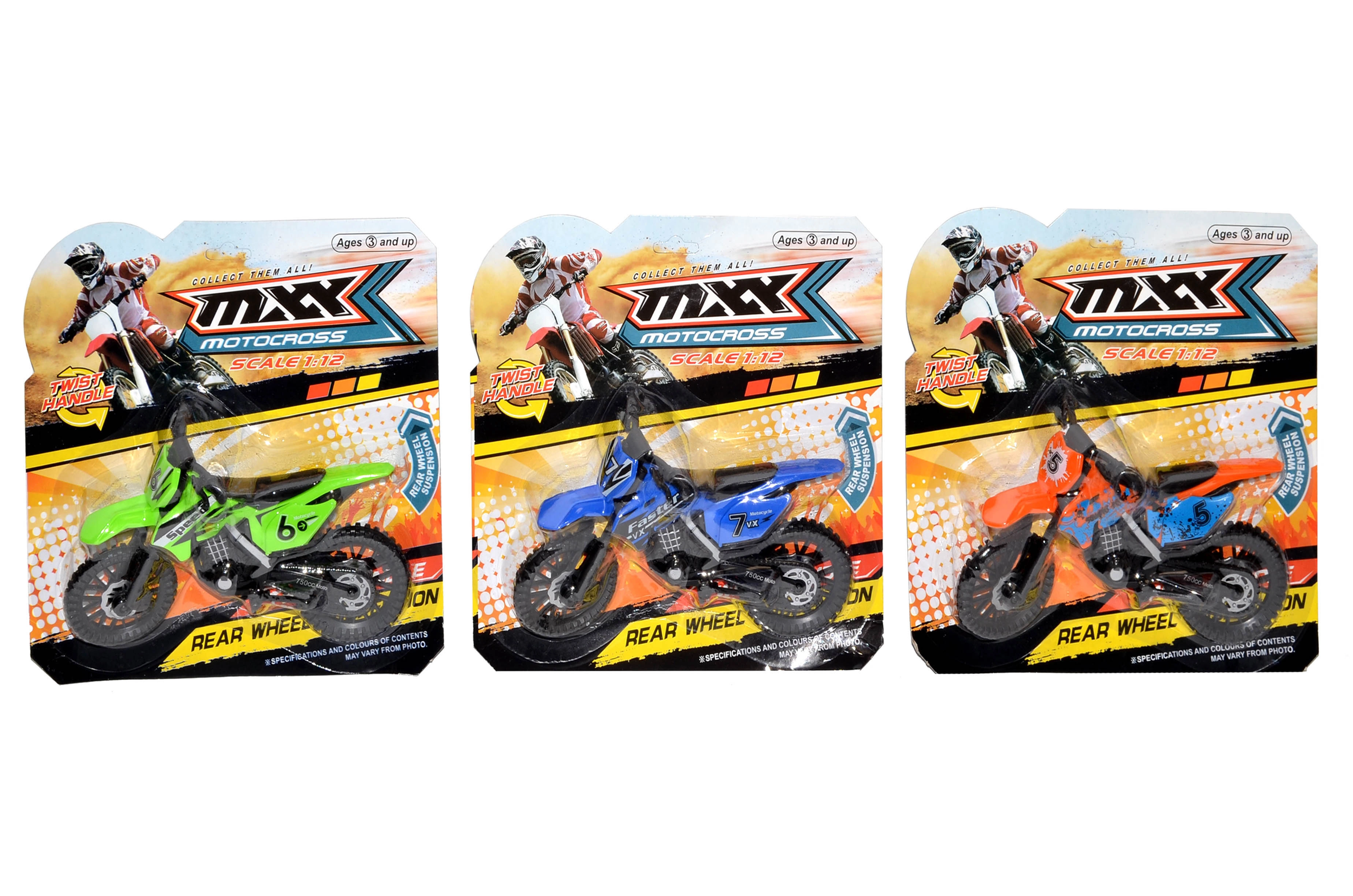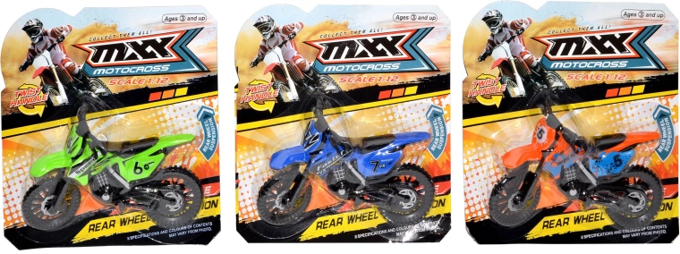 Motocikls ir pieejams 3 krāsu variantos ar sacīkšu apdrukām (numuri, uzraksti) un iespaidīgu off-road stilu. Kompaktais 19 cm izmērs lieliski der bērna rokai un mugursomai ceļojumiem.