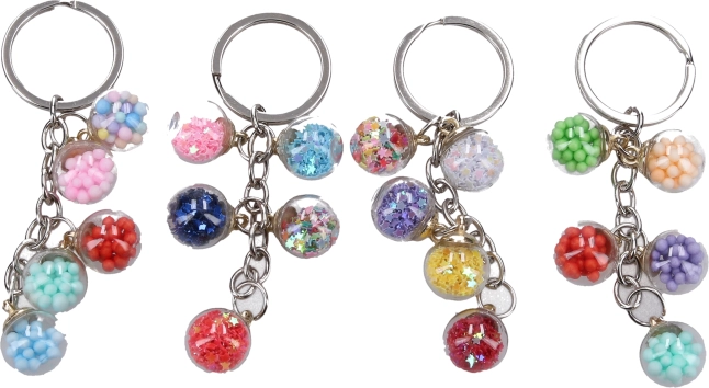 Pievienojiet ikdienas sīkumiem šarmu ar atslēgu piekariņu, kas rotāts ar dažādu krāsu stikla bumbiņām. Pateicoties rūpīgam izpildījumam un izturīgam metāla gredzenam, piekariņš ir ne tikai efekts, bet arī praktisks – to viegli piestiprināt pie atslēgām, mugursomas, somas vai telefona.