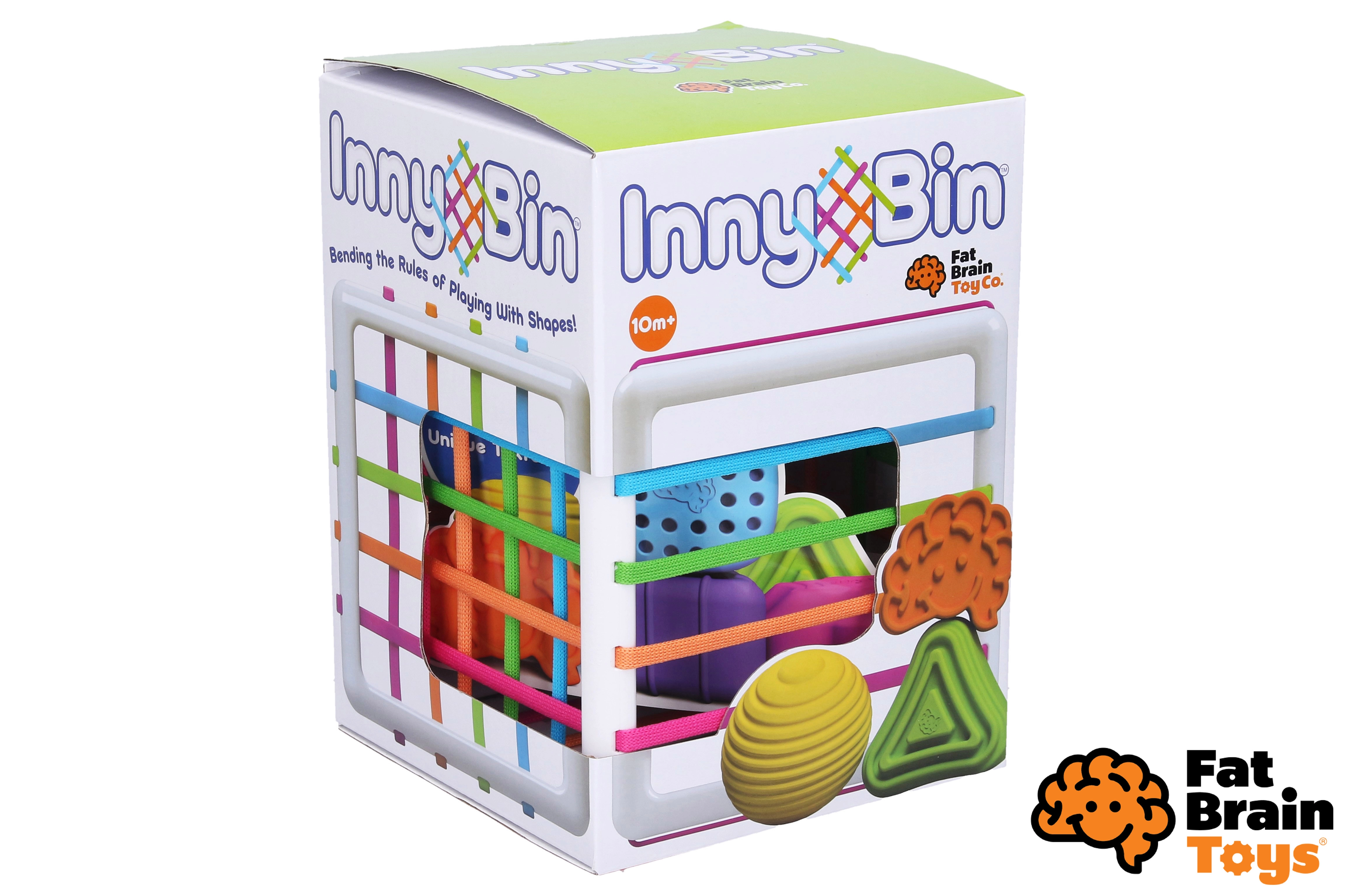 InnyBin no FAT BRAIN ir mūsdienīga šķirojamā kaste, kas klasisko formu šķirošanu pārvērš interaktīvā sensorā spēlē. Bērni var formas spiest, satvert, ielikt un izņemt caur krāsainajām elastīgajām auklām – bez vajadzības precīzi trāpīt atverē. Tas attīsta pirkstu veiklību, pacietību un dabisko ziņkāri.