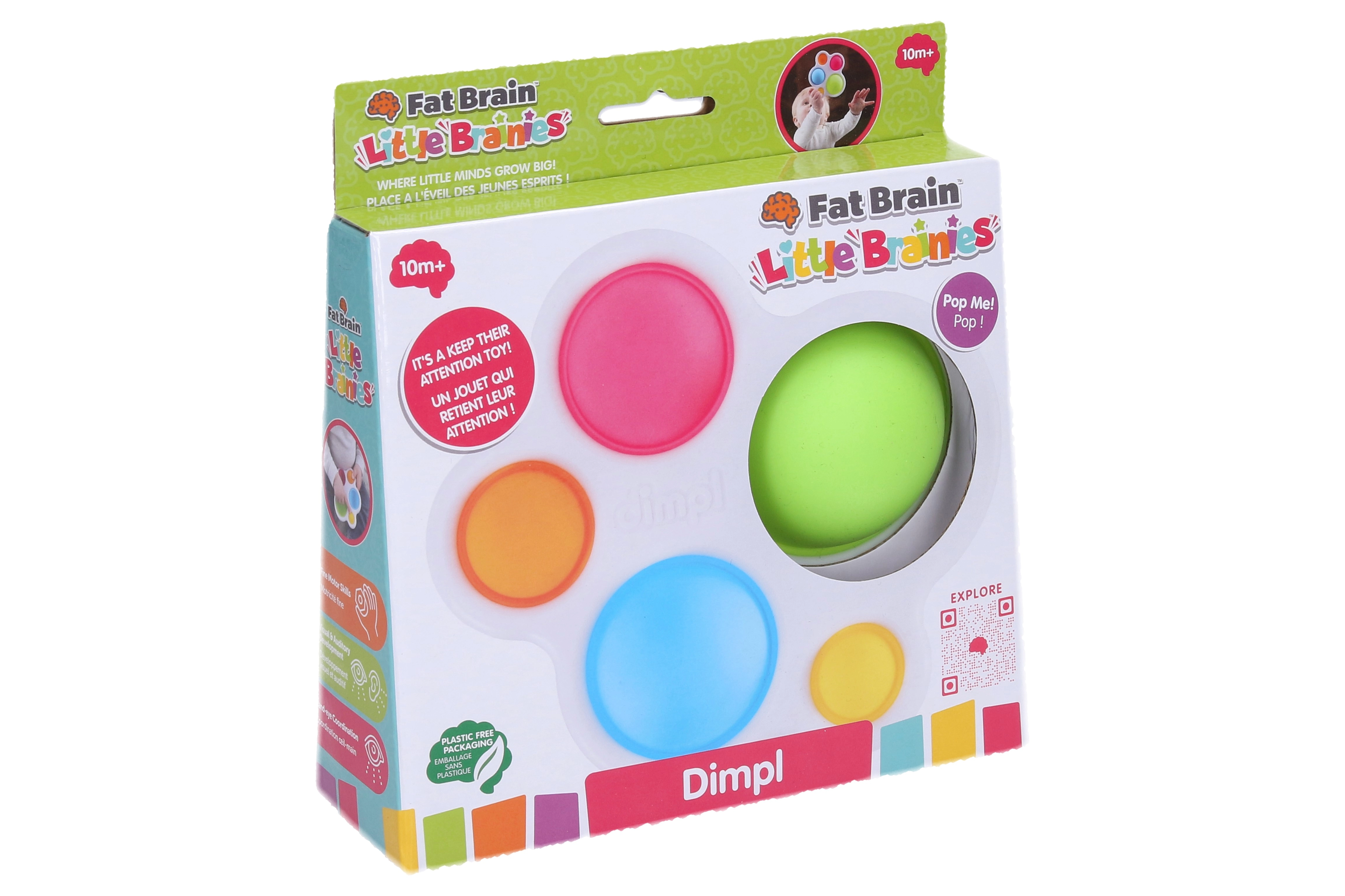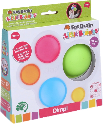 Dimpl no FAT BRAIN ir kompakta maņu rotaļlieta ar piecām krāsainām silikona burbuļbumbām stingrā plastmasas rāmī. Katra burbuļbumba no abām pusēm ir spaidāma un “sprāgstoša”, kas bērnus uzreiz aizrauj un motivē atkārtoti atklāt.
