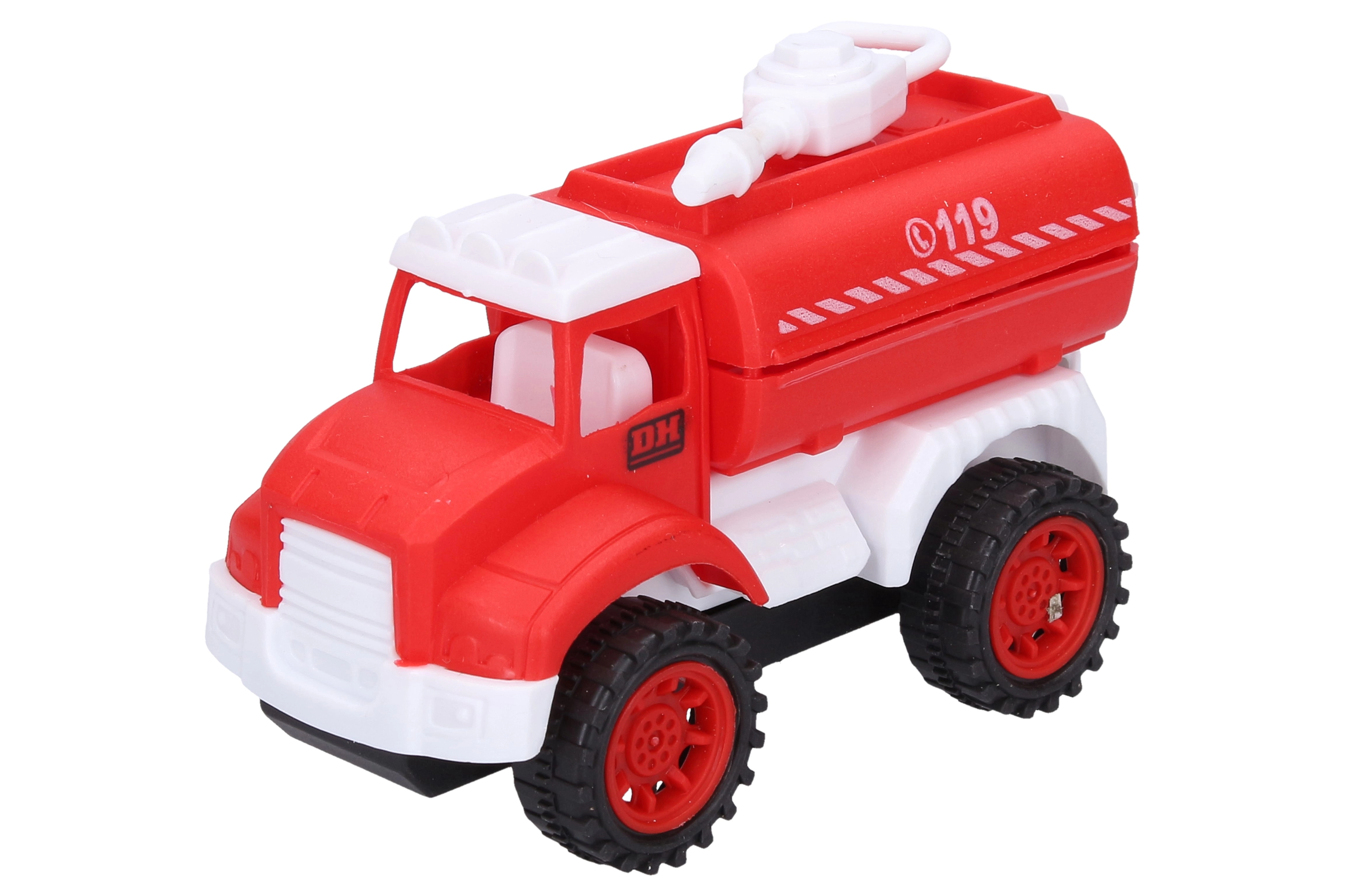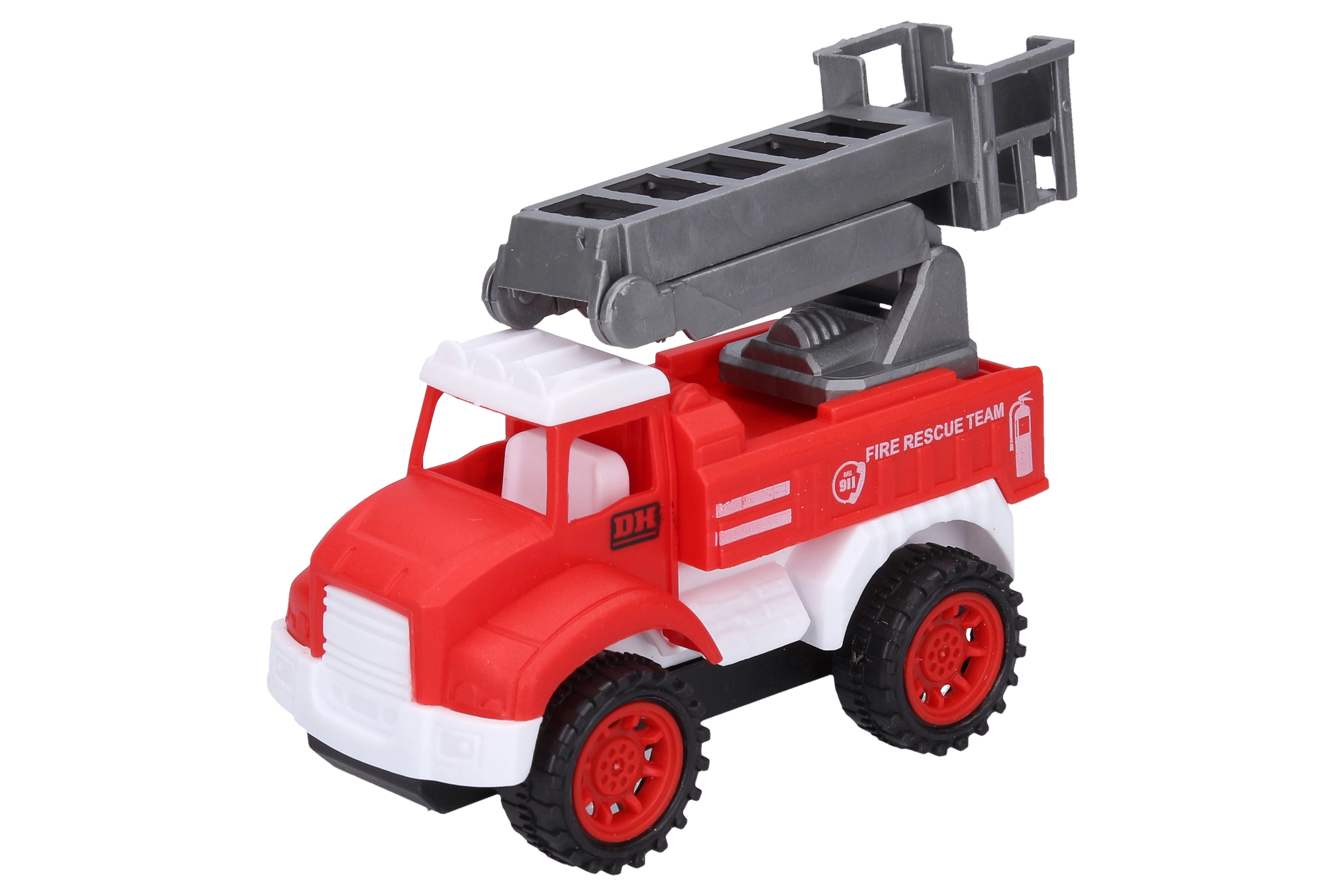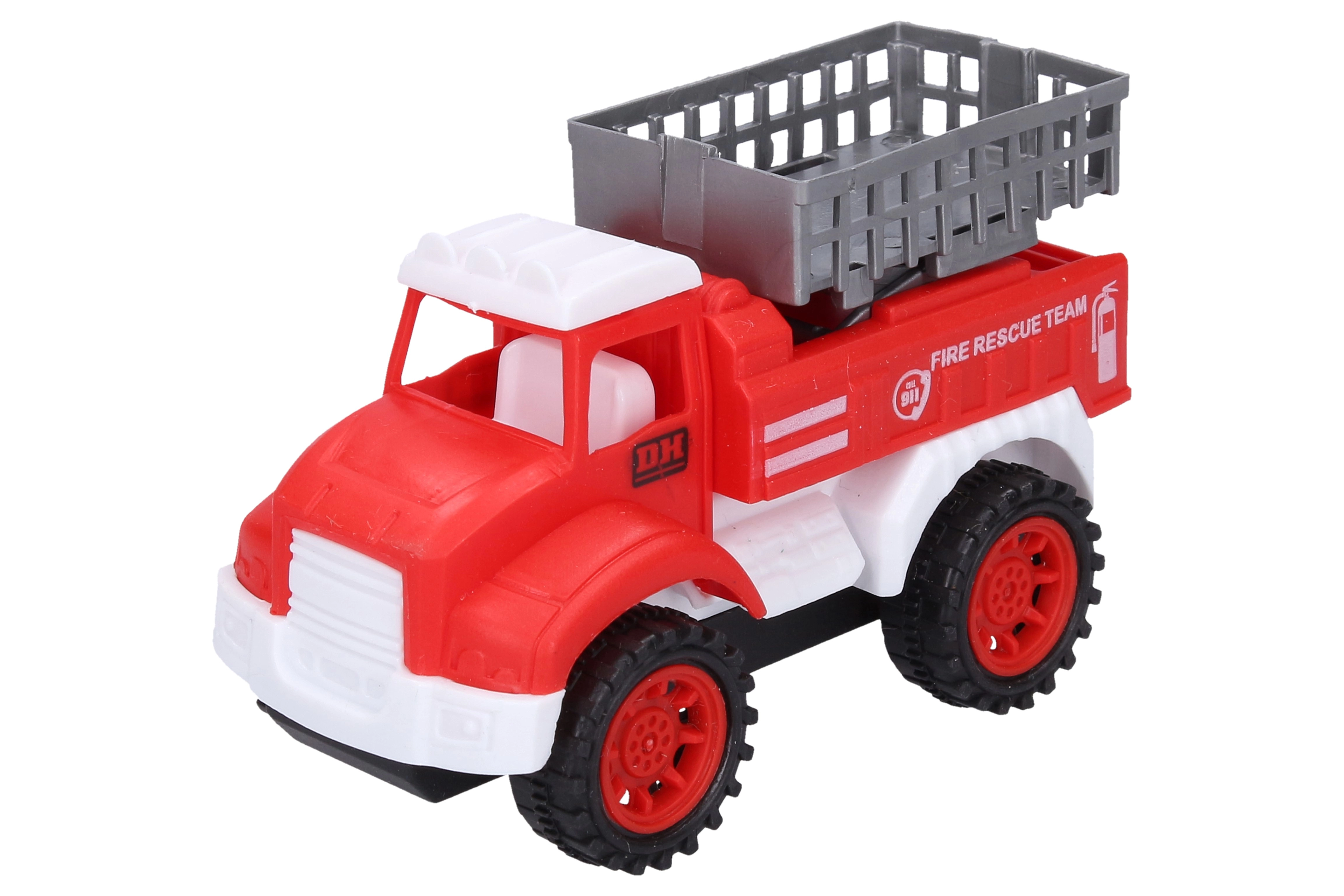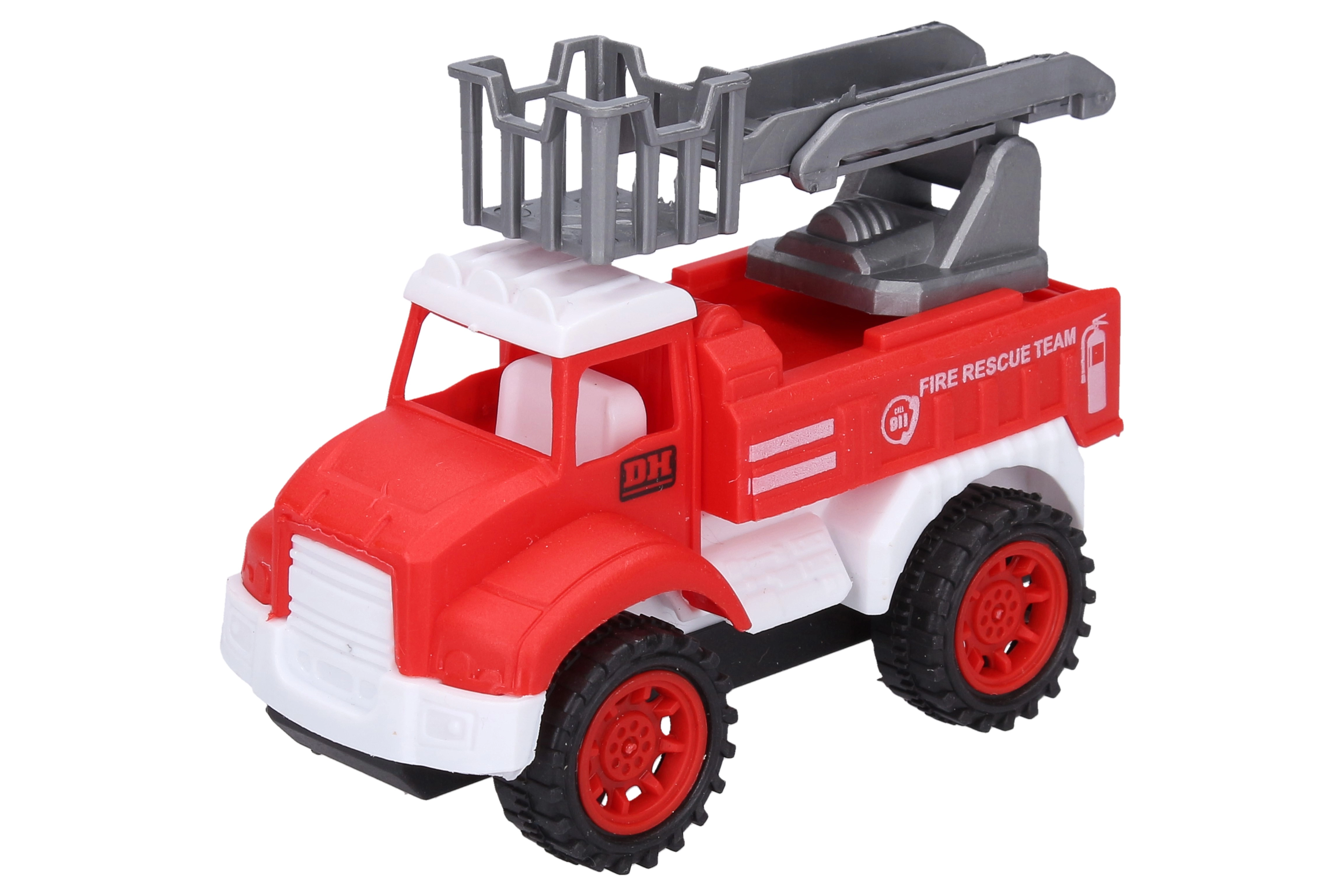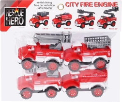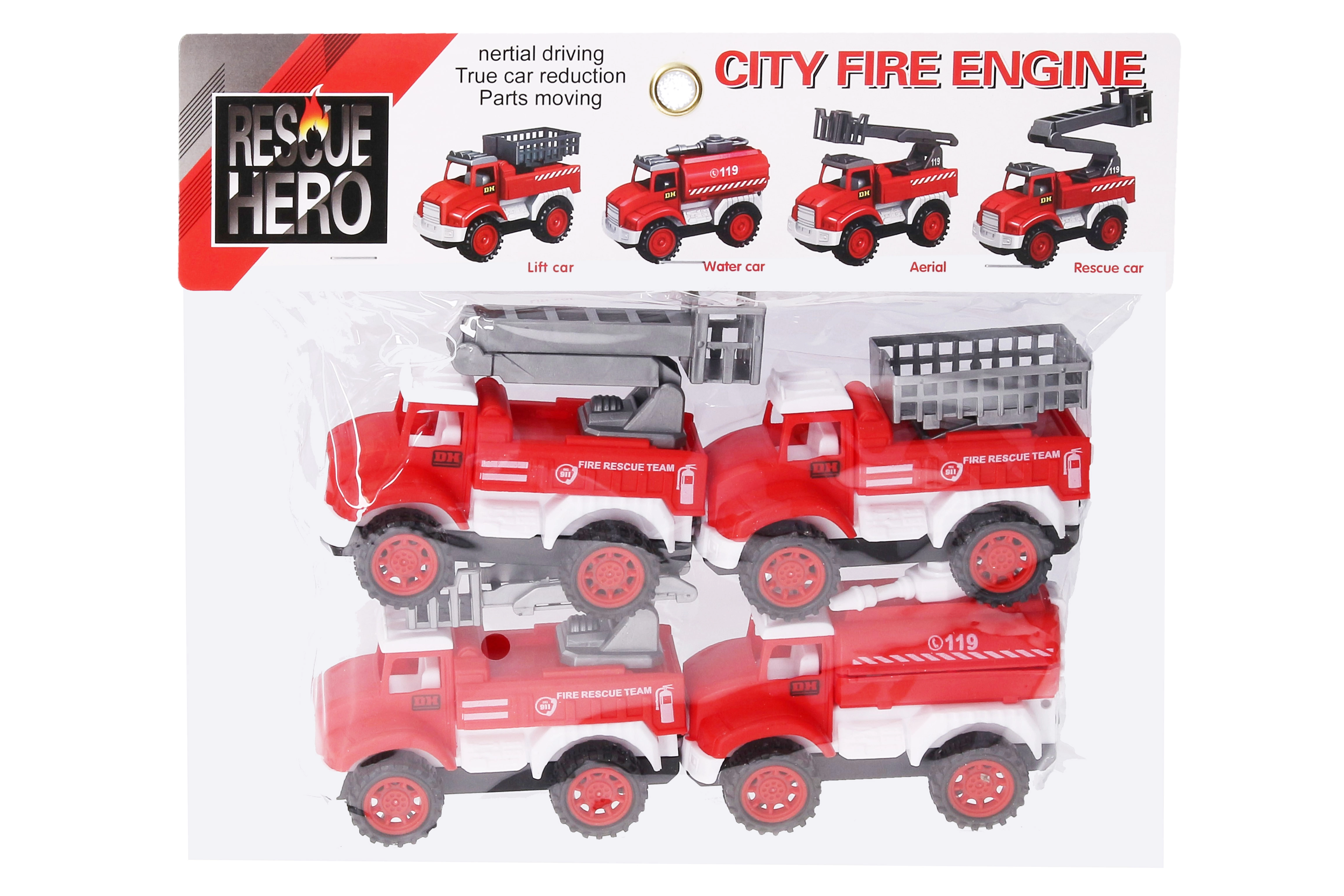 Komplektā ir četri sarkani ugunsdzēsēju automobiļi 10,5 cm garumā, katrs attēlo citu ugunsdzēsēju transporta veidu: