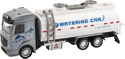 Laistīšanas automašīnas modelis ar pelēku kabīni un baltu tvertni piedāvā tematisku spēli ar ūdens elementiem.