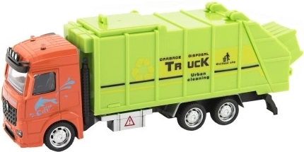 Šis atkritumu savākšanas auto ar oranžu kabīni un zaļu virsbūvi ienes spēlē pilsētas uzturēšanas elementus.