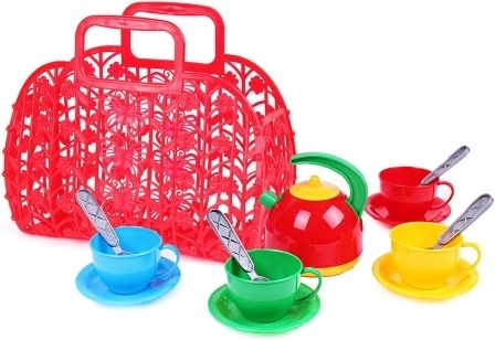 Krāsaina bērnu tējas servīze ir ideāla mazajām saimniecītēm! Šajā komplektā ir viss nepieciešamais tējas rīkošanai, un tas ir ievietots praktiskā plastmasas somā, kas novērš atsevišķu detaļu nozaudēšanu.