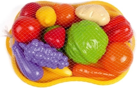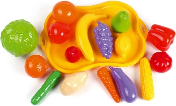 Plastmasas augļu un dārzeņu komplekts sniedz lielisku iespēju bērniem apgūt dažādu pārtikas produktu atpazīšanu. Komplektā ir augļu un dārzeņu atrises uz stabilas dzeltenas paplātes. Veicina kognitīvo attīstību un palīdz bērniem izprast veselīga uztura pamatus.