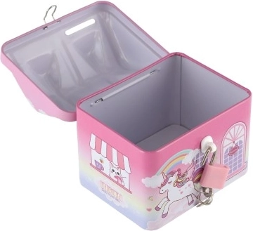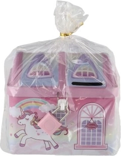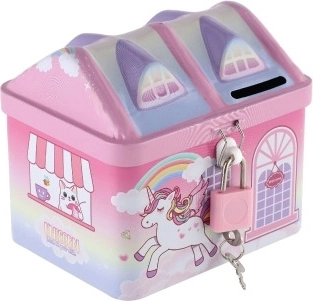 Jautra un koša krājkase mājiņas formā ir lieliska dāvana bērniem, kuri vēlas droši glabāt savus ietaupījumus. Šī metāla mājiņa ar vienradža un varavīksnes motīvu ne tikai sargā dārgumus, bet arī rotā bērnu istabu.