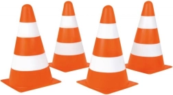 Četri oranži konusi ir ideāli piemēroti spēlēm ar bumbu, rotaļmašīnām vai kā palīglīdzeklis remonta laikā. Ar tiem var izveidot zonu sportiskām aktivitātēm vai iezīmēt drošības perimetru.