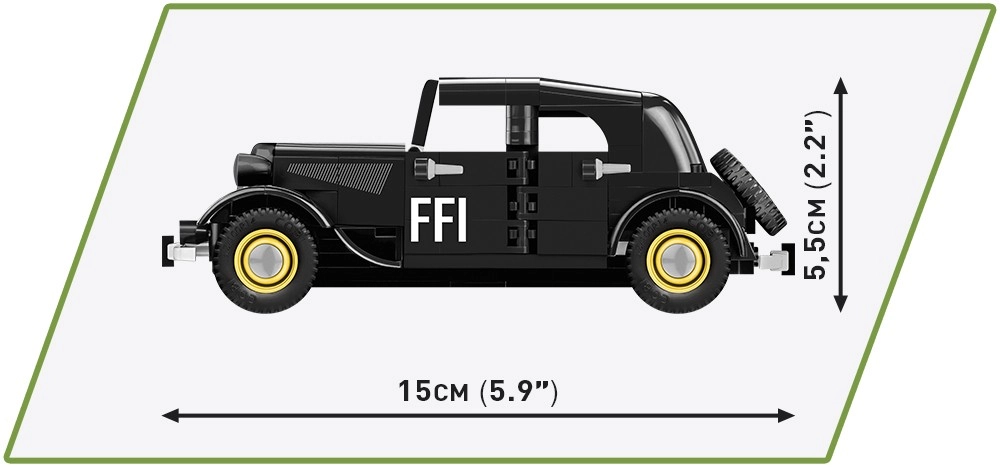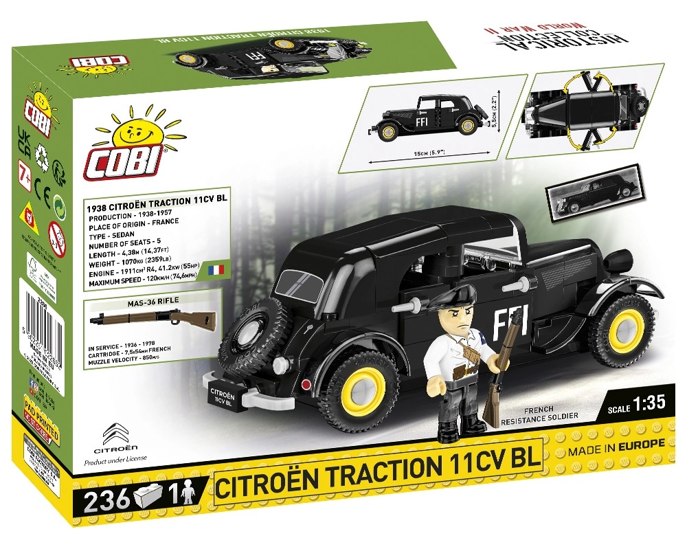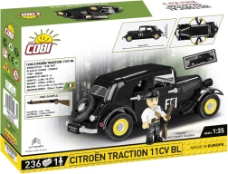 Ikoniskais auto CITROËN Traction 11CV BL (zināms arī kā Traction Avant) bija pašnesošās virsbūves un priekšējo riteņu piedziņas pionieris. Šis licencētais COBI komplekts ļauj uzbūvēt reālistisku modeli ar autentiskām detaļām un apdrukām, tostarp Forces françaises de l’Intérieur (FFI) simboliem no Otrā pasaules kara perioda.