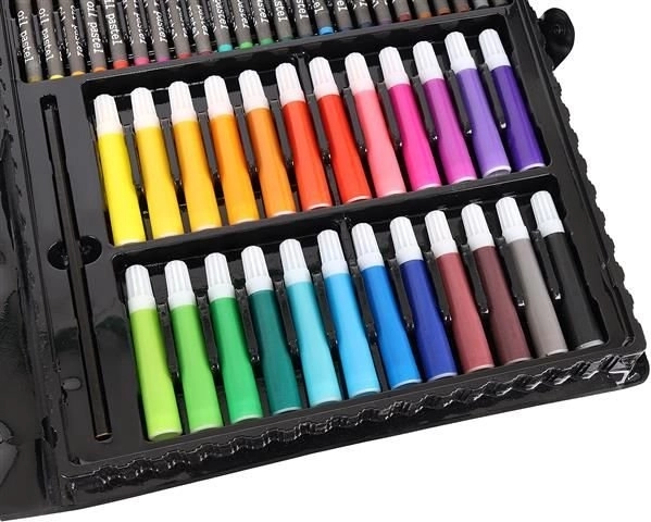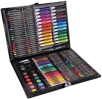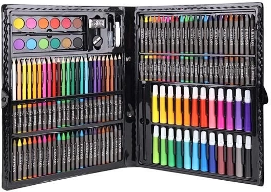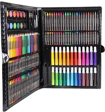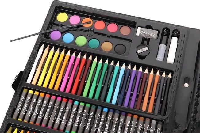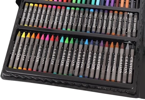 Komplektā ir plaša mākslas piederumu izvēle – no krītiņiem līdz akvareļu krāsām –, kas to padara ideālu dažādiem radošiem projektiem.