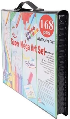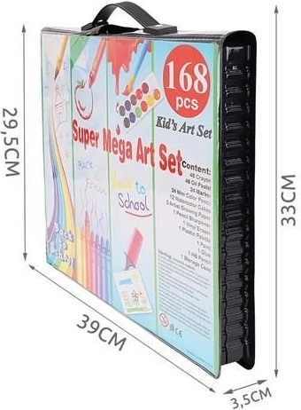 Super Mega mākslas piederumu komplekts, 168 gab., piedāvā visu, kas nepieciešams mākslas darbu radīšanai: 24 pasteļkrītiņi, 24 krāsainie flomāsteri, 48 eļļas pasteļi, 48 vaska krītiņi, 12 akvareļu krāsas un daudz kas cits. Visi piederumi ir eleganti sakārtoti praktiskā futrālī, kas nodrošina ērtu piekļuvi un pārskatāmību.