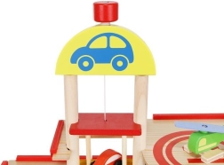 Atklājiet robustu koka autostāvvietu ar garāžu, kas piedāvā trīs spēļu stāvus ar rampām, funkcionālu liftu un augšējo heliportu. Bērniem patiks reālistiski elementi, piemēram, auto mazgātava, degvielas uzpildes stacija un biļešu pārdošana, kas rada autentiskus satiksmes scenārijus.