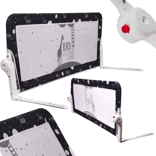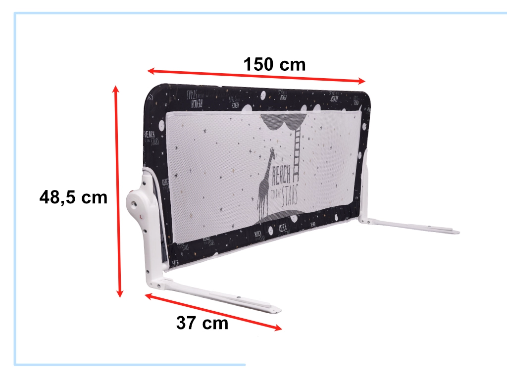 Praktiska bērnu gultas barjera 150 cm garumā ar nolokāmu mehānismu novērš bērna nejaušu izkrišanu no gultas naktī. Pateicoties izturīgajai metāla konstrukcijai, noturīgajiem plastmasas savienojumiem un elpojošam sietiņam, tā nodrošina uzticamu aizsardzību, vienkāršu montāžu bez urbšanas un ērtu nolocīšanu ar vienu pogu spiedienu.