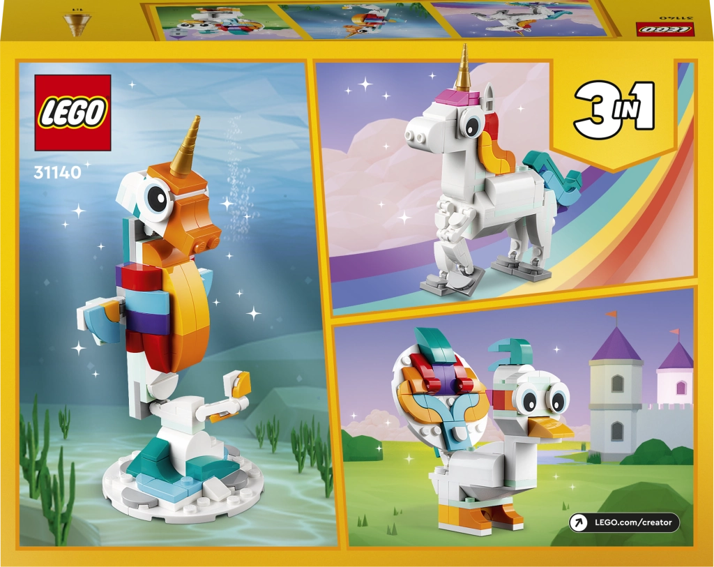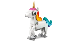 Atklājiet fantāzijas pasauli ar LEGO Creator 3 vienā Burvju vienradzi. Bērni no 7 gadu vecuma varēs būvēt un spēlēties ar trim modeļiem vienā – vienradzi, jūraszirdziņu un pāvu. Kustīgas daļas, krāsains dizains un iespēja izstādīt uz statīva pārvērš katru rotaļu maģiskā piedzīvojumā.