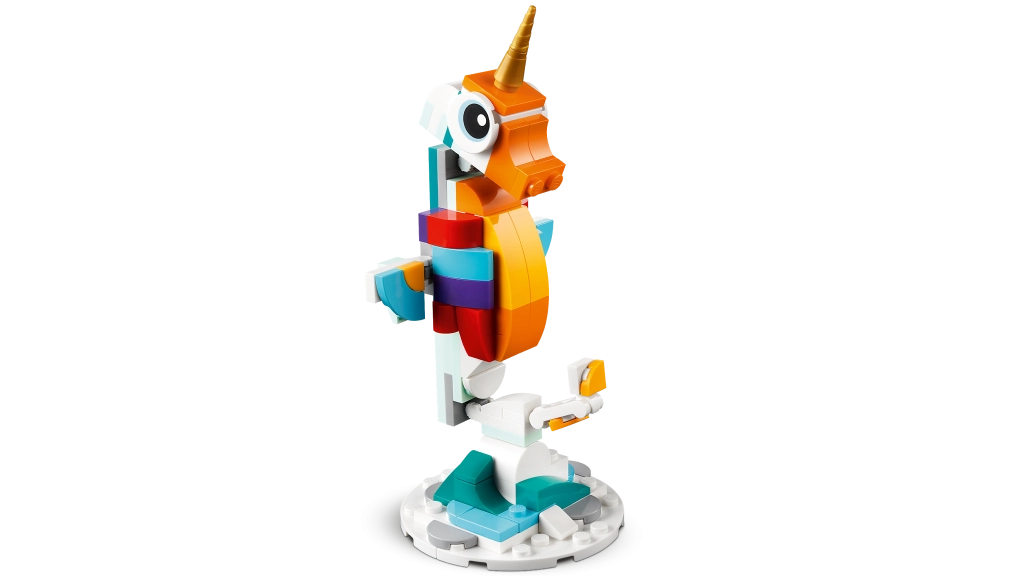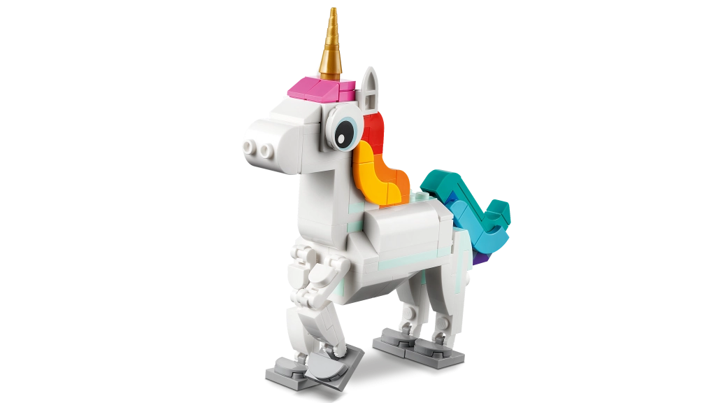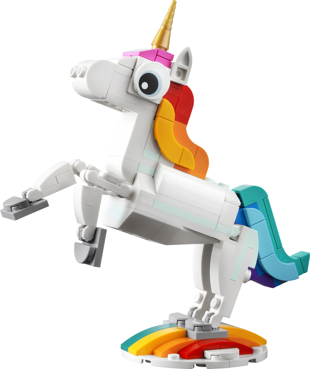 Ar šo burvīgo komplektu bērni uzbūvē glītu vienradzi ar zeltainu ragu, varavīksnes asti un kustīgām kājām un nagiem. Modelli var izstādīt uz varavīksnes pamatnes un novietot klasiskā pozā uz divām aizmugurējām kājām vai arī stāvināt uz visām četrām.