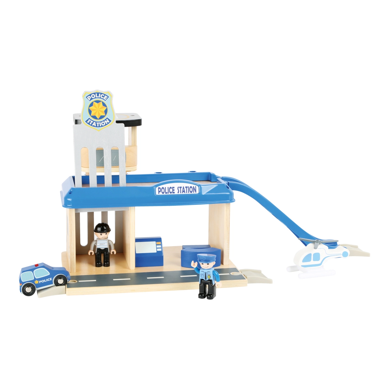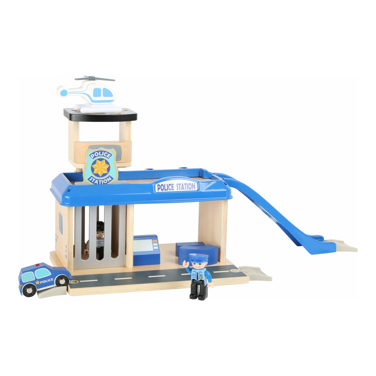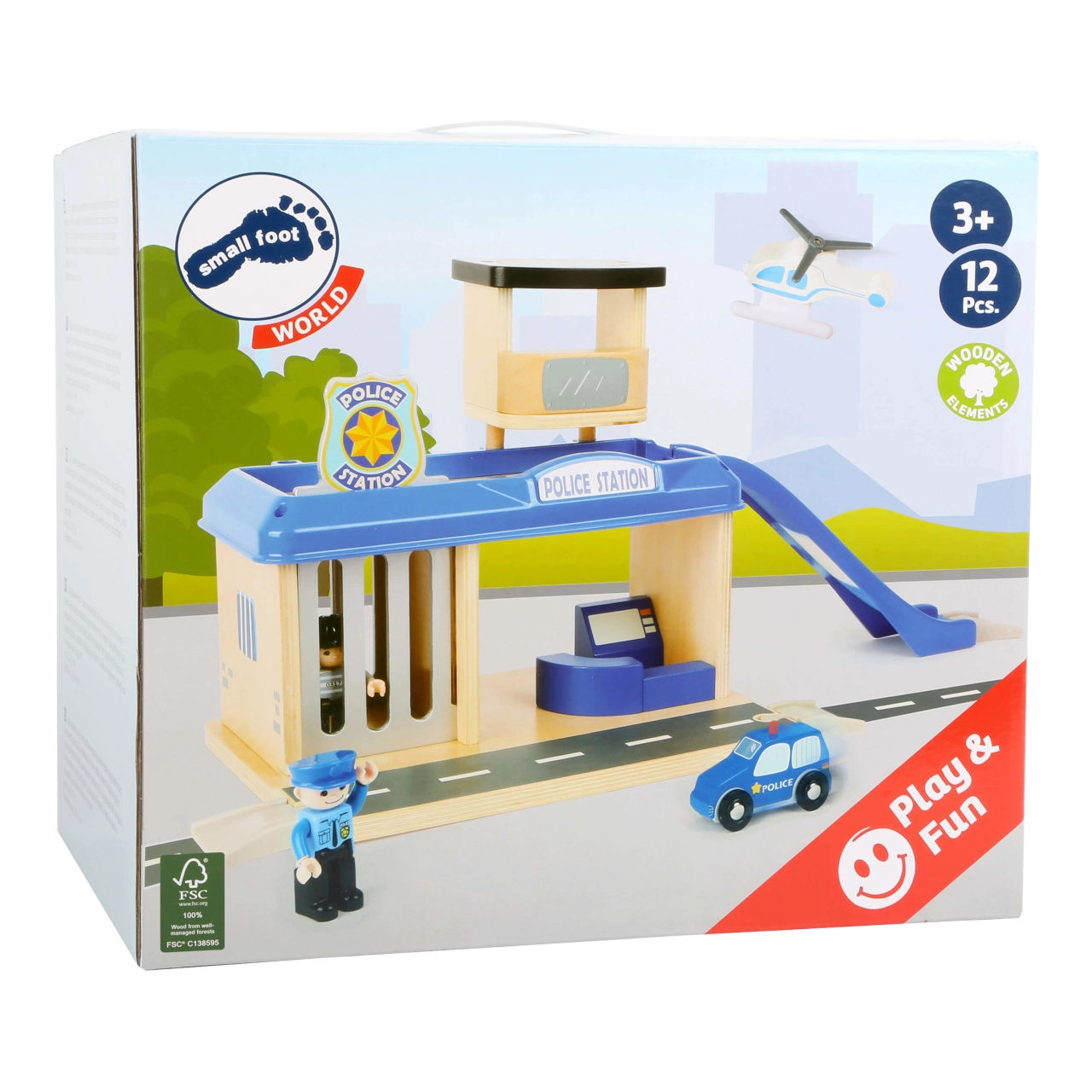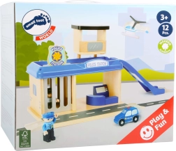 Dāvini bērniem piedzīvojumu pasauli ar šo small foot policijas staciju no 100% FSC® koka. Divstāvu stacija ar torni un helipoliju, cietumu ar izbīdāmu restotu durtiņu un uzbrauktuvi nāk ar bagātīgu komplektāciju: policijas auto, helikopters un divas figūriņas. Izturīgā koka un kvalitatīvas plastmasas kombinācija garantē izturību un ilgmūžību, turklāt komplekts ir savietojams ar citu zīmolu vilcienu trasēm.