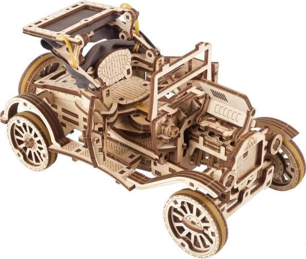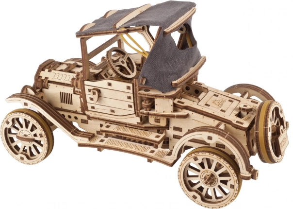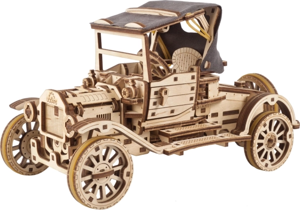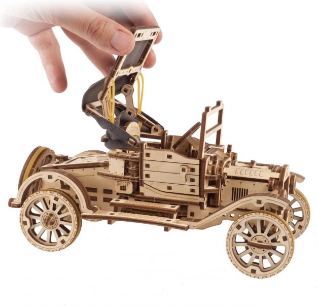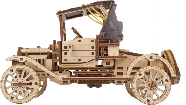 Ienāciet vēsturisko transportlīdzekļu pasaulē ar šo koka modeli, iedvesmotu no ikoniskā Ford Model T. Modelis piedāvā atveramas durvis, salokāmu auduma jumtu un iespēju braukt patstāvīgi, tostarp ar atpakaļgaitu.