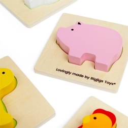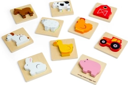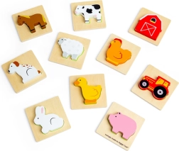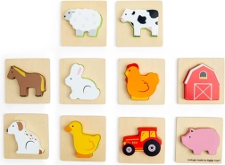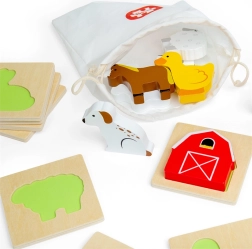 Šī ceļojumu spēle par fermas tēmu sniedz bērniem atklājumu prieku. Viņi ieliek roku auduma maisiņā un pēc taustes meklē gabaliņu, kas der atbilstošajai koka pamatnei. Izklaide, kas nemanāmi veicina koncentrēšanos, acu–roku koordināciju, kā arī vārdu krājumu, nosaucot dzīvniekus un fermas priekšmetus.