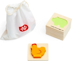 Komplektā ir 8 iemīļoti lauksaimniecības dzīvnieki un 2 fermas motīvi (traktors un šķūnis). Gabaliņi ir stingri, krāsaini un patīkami rokā. Pateicoties kompaktajam auduma maisiņam, spēle ir perfekta ceļojumiem, restorānā vai pie vecvecākiem.