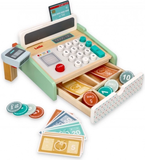 Šī skaistā pasteļkrāsas kase elegantā koka dizainā sniedz bezgalīgas izklaides stundas un vienlaikus veicina bērnu matemātisko prasmju attīstību.
