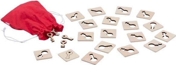 - 1 kokvilnas maisiņš, 16 atslēgas, 16 plāksnītes, instrukcija