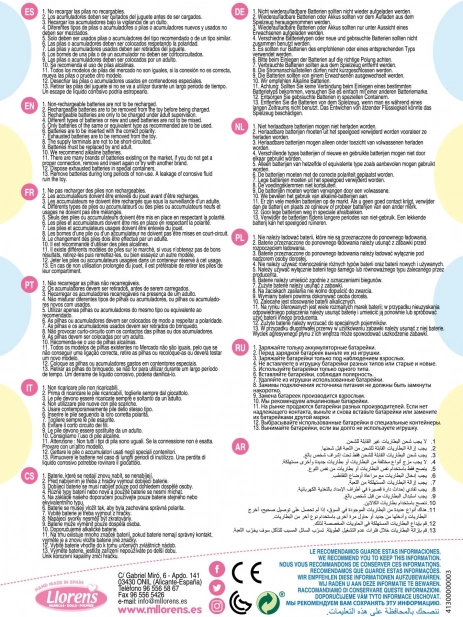 Lelle ir roku darbs Spānijā ar uzsvaru uz kvalitāti un detaļām. Komplektā ietilpst knupītis kā aksesuārs un 3× pogbaterijas LR44 ar instrukciju nomaiņai. Lieliska kā dāvana dāvanu kastē un saderīga ar LLORENS NEW BORN zīdaiņu apģērbiem izmēros 40–42 cm un 43–45 cm.