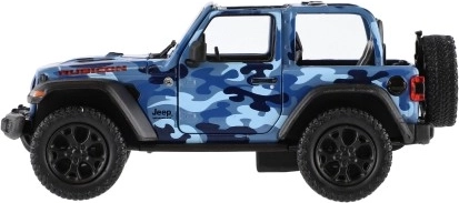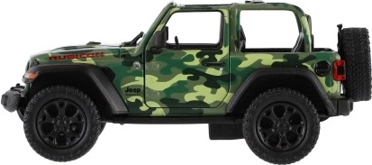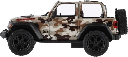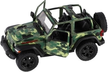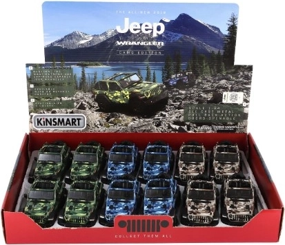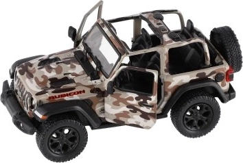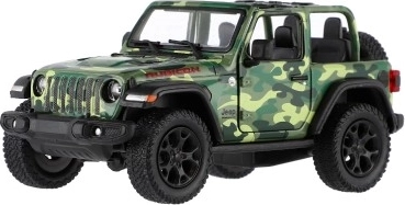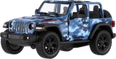 Metāla Jeep Wrangler automašīnas modelis, Camo izlaidums ar reālistiskām detaļām, atveramām durvīm un atpakaļgaitas inerces mehānismu, pieejams trīs krāsās. Ideāli piemērots mazajiem piedzīvojumu meklētājiem un kolekcionāriem.