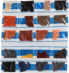 - iepriekš apdrukāts audekls ar simboliem un līmējošu slāni, aplikators-pildspalva, trauciņš, vasks, krāsainu akmentiņu komplekts