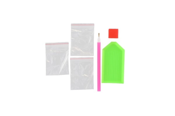 - Pilns aprīkojums: audekls ar leģendu, aplikators-pildspalva, trauciņš, vasks, krāsainu akmentiņu komplekts.